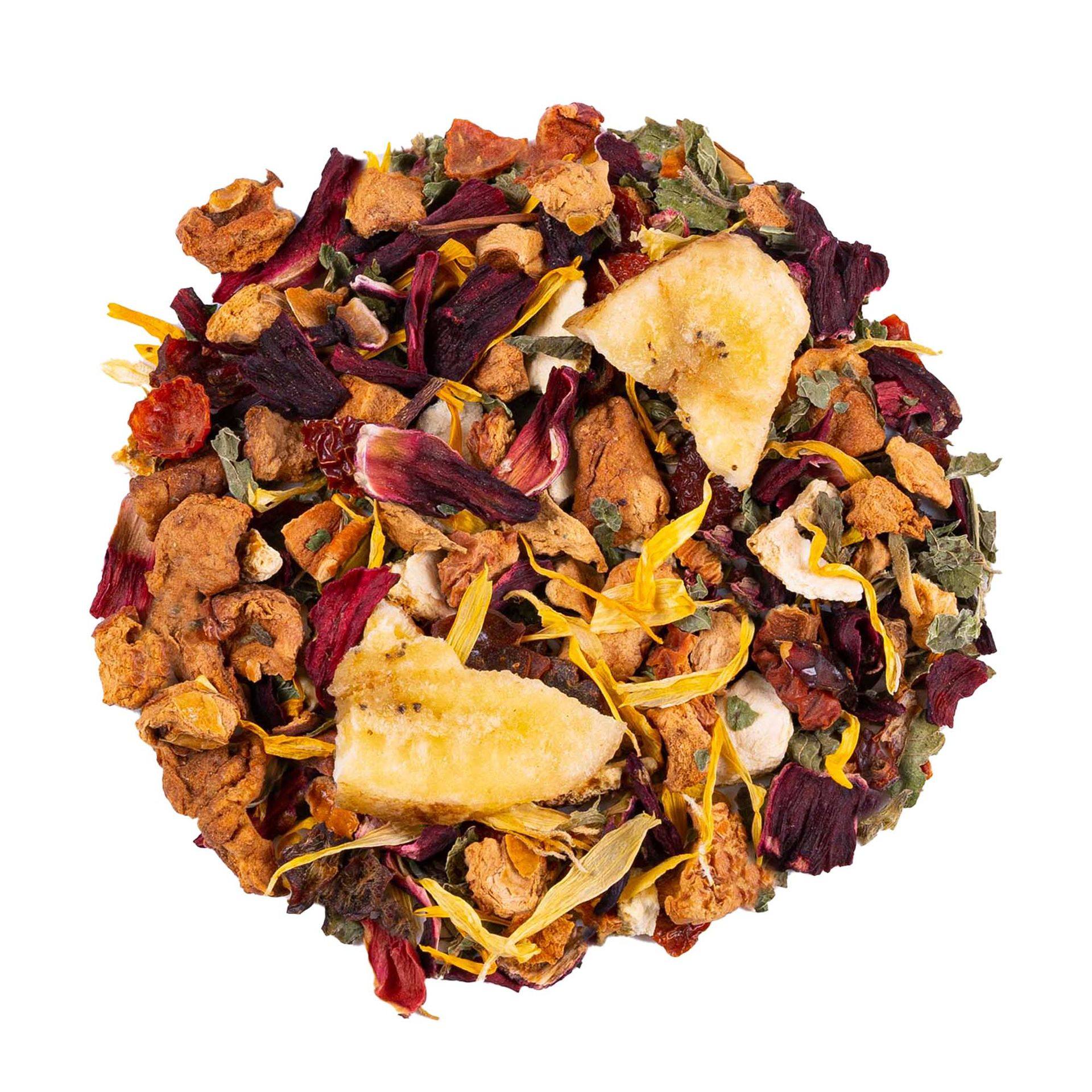 Pomme*, hibiscus*, cynorrhodon*, mélisse*, écorces d'orange*, banane (banane, huile de noix de coco, sucre de canne, miel)*, arôme naturel d'orange, fleurs de souci*, arôme naturel de mangue, mangue*.