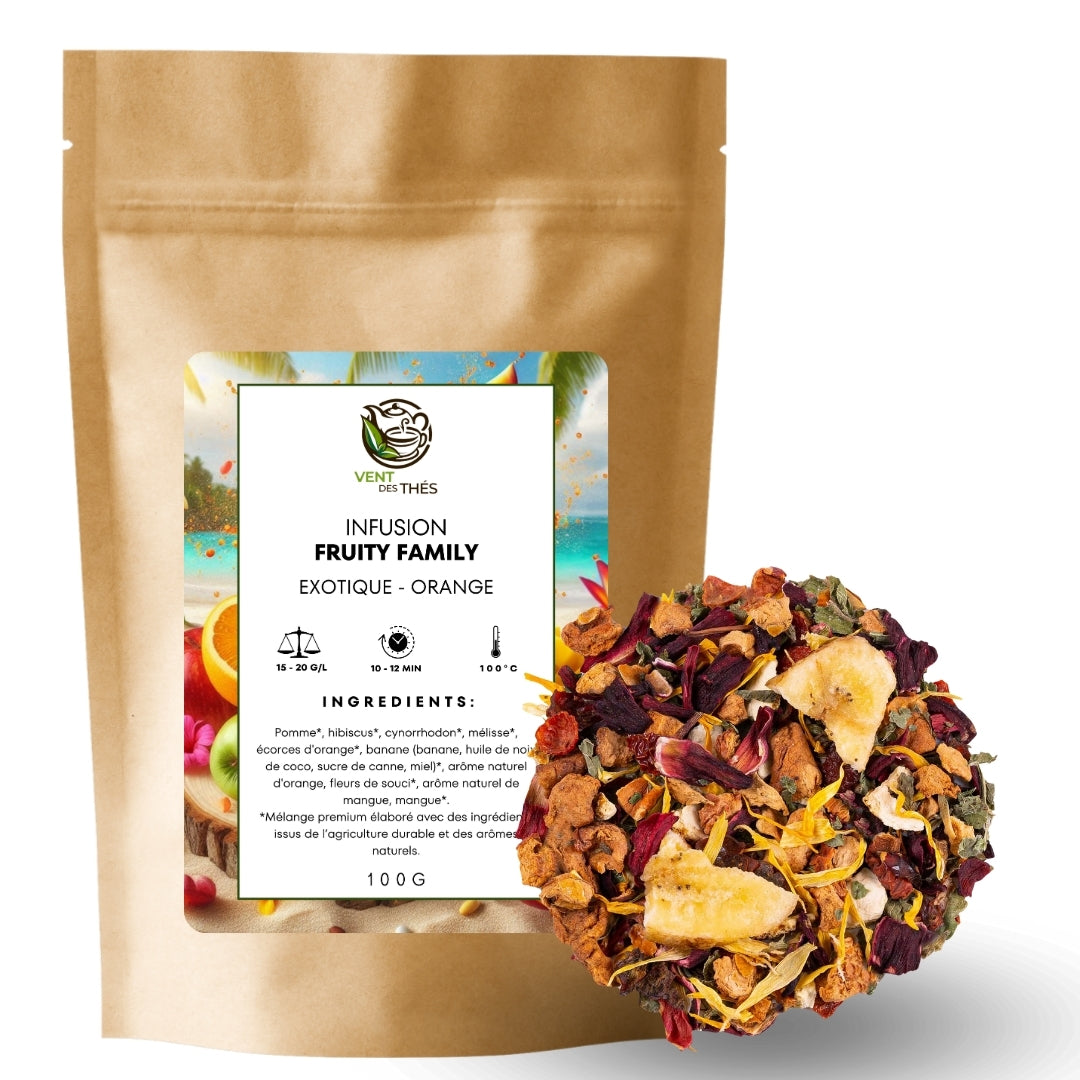 Découvrez notre Infusion Fruity Family, une boisson joyeusement fruitée parfaite pour toute la famille. Avec ses saveurs naturelles et délicieuses, elle ravira les petits et les grands. Idéale pour partager des moments de convivialité et d’hydratation tout au long de la journée !
