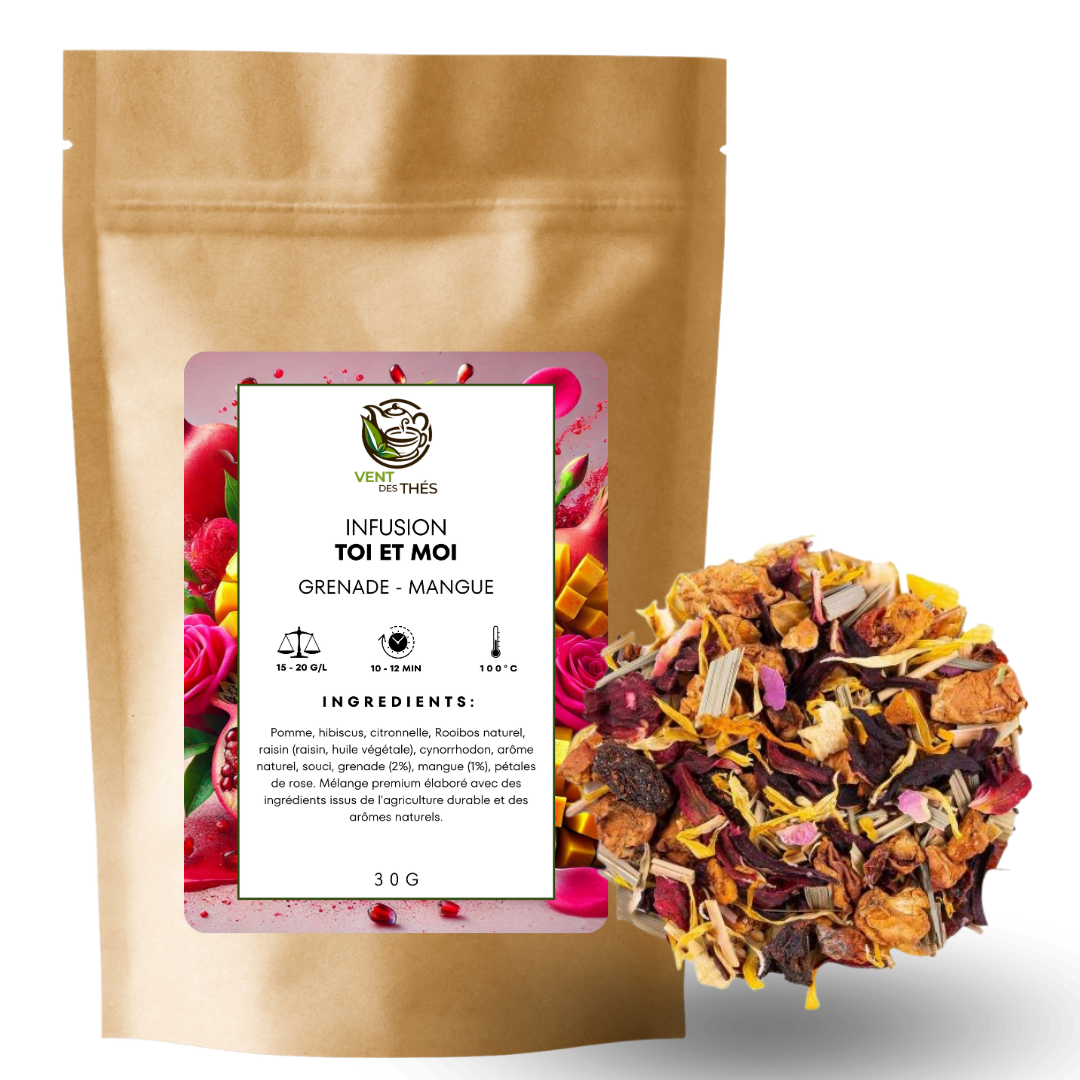 Laissez vous séduire par une infusion délicatement fruitée, mêlant les notes exotiques de la mangue à la douceur acidulée de la grenade. Une pause gourmande et réconfortante, idéale à tout moment de la journée.