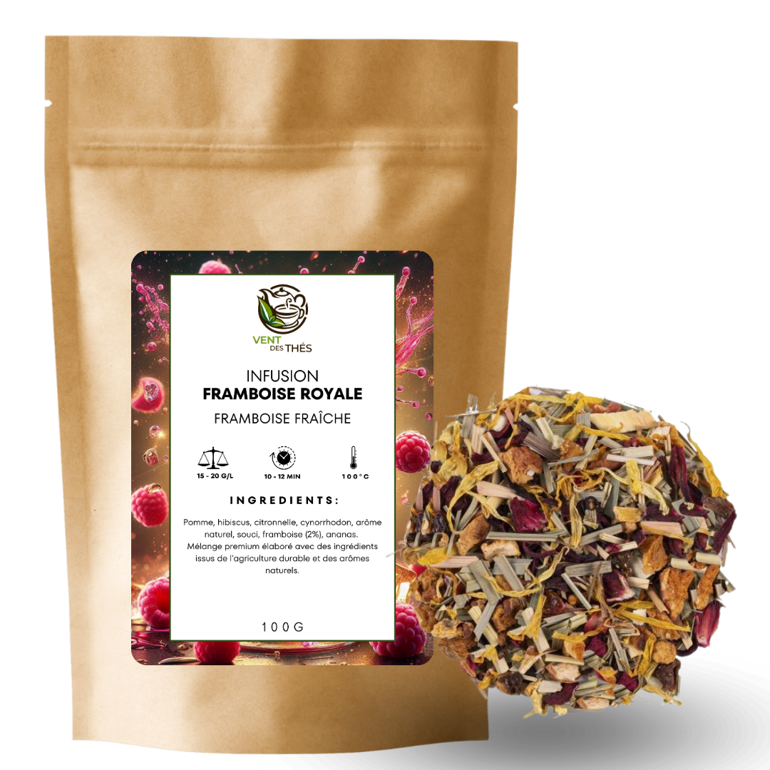 L'infusion Framboise Royale saveur framboise fraîche vous offre une expérience fruitée et parfumée, idéale pour une pause rafraîchissante. Cette infusion sans caféine, naturellement douce, se déguste à tout moment de la journée. Parfaite pour ceux qui recherchent une boisson délicate et pleine de saveurs fruitées.
