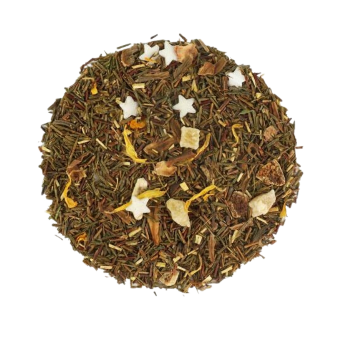 Rooibos vert, Étoiles en sucre (sucre, farine de riz, huiles et graisses végétales (colza), fécule de pomme de terre, arôme) (10%), hibiscus blanc, ananas (ananas, sucre), écorces de citron, arôme, fleurs de souci, Stevia.