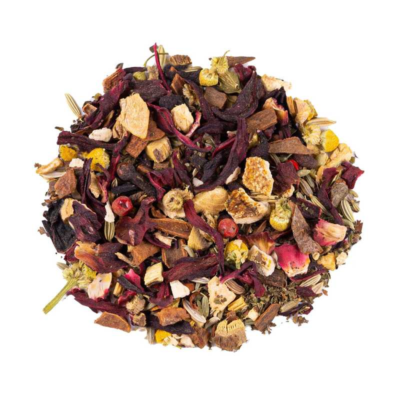 Menthe* (29%), hibiscus*, bâtons de cannelle* (12%), racine de réglisse*, fenouil* (11%), gingembre*, écorces d'orange*, cannelle Ceylan*, clou de girofle*, camomille* (3%), poivre rose*, cardamome*.
