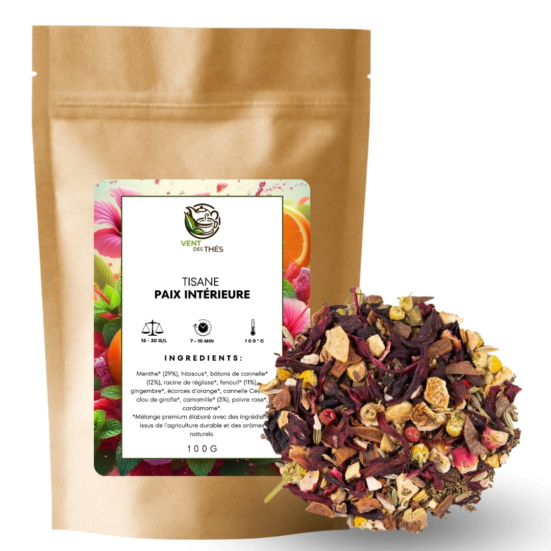 Découvrez notre Tisane Paix Intérieure, une infusion apaisante qui favorise la sérénité et le bien-être. Composée d'un mélange délicat de plantes, elle est idéale pour créer une pause relaxante et savourer un moment de calme au quotidien.