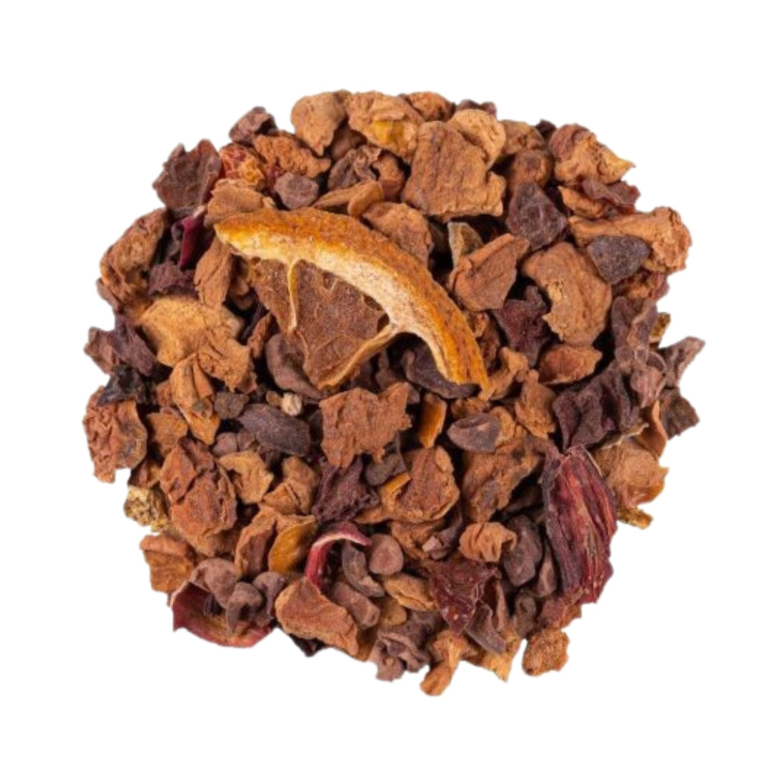 Pomme*, fève de cacao concassée* (21%), betterave rouge*, cynorrhodon*, écorces d'orange* (6%), hibiscus*, racine de chicorée*, tranches d'orange* (3%), arôme naturel d'orange, poudre de cacao* (2%), extrait de cacao* (1%), Huile essentielle de mandarine*, extrait de vanille*.