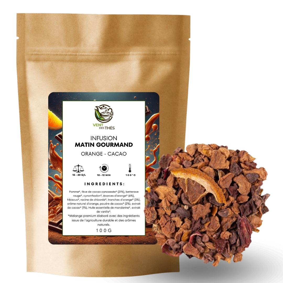 L'infusion Matin Gourmand est une délicieuse combinaison d'agrumes frais et de notes gourmandes de cacao. Ce mélange subtil offre une expérience sensorielle unique, idéale pour les moments de détente. Avec ses arômes naturels d'orange et son goût chocolaté, cette infusion sans théine est parfaite à tout moment de la journée.